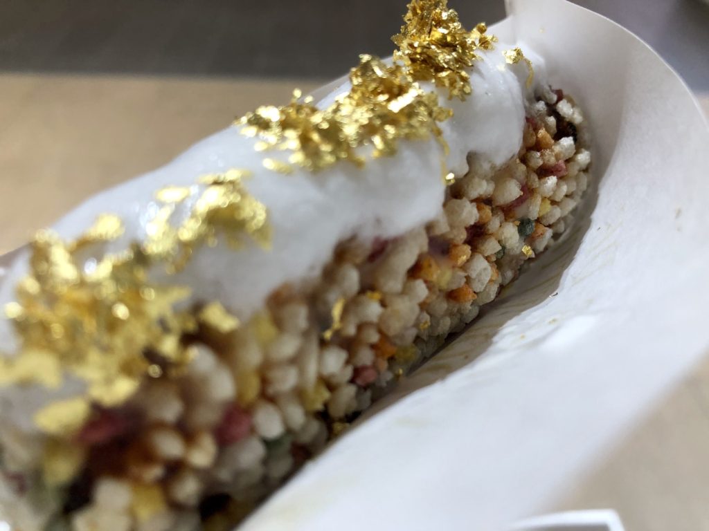 コロッケ(金澤クロケット)はオーダーが入ってから一つ一つ丁寧に揚げてくれます。カラッと揚げられたコロッケの上の白いムースは白だしで、そのさらに上に金箔がふりかかっています。