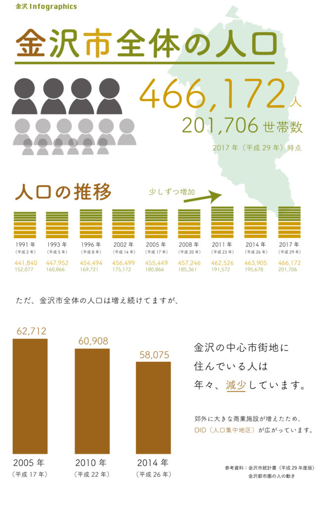 ただ、金沢市全体の人口は増え続けてますが、金沢の中心市街地に住んでいる人は年々、減少しています。郊外に大きな商業施設が増えたため、DID(人口集中地区)が広がっていることが原因です。
